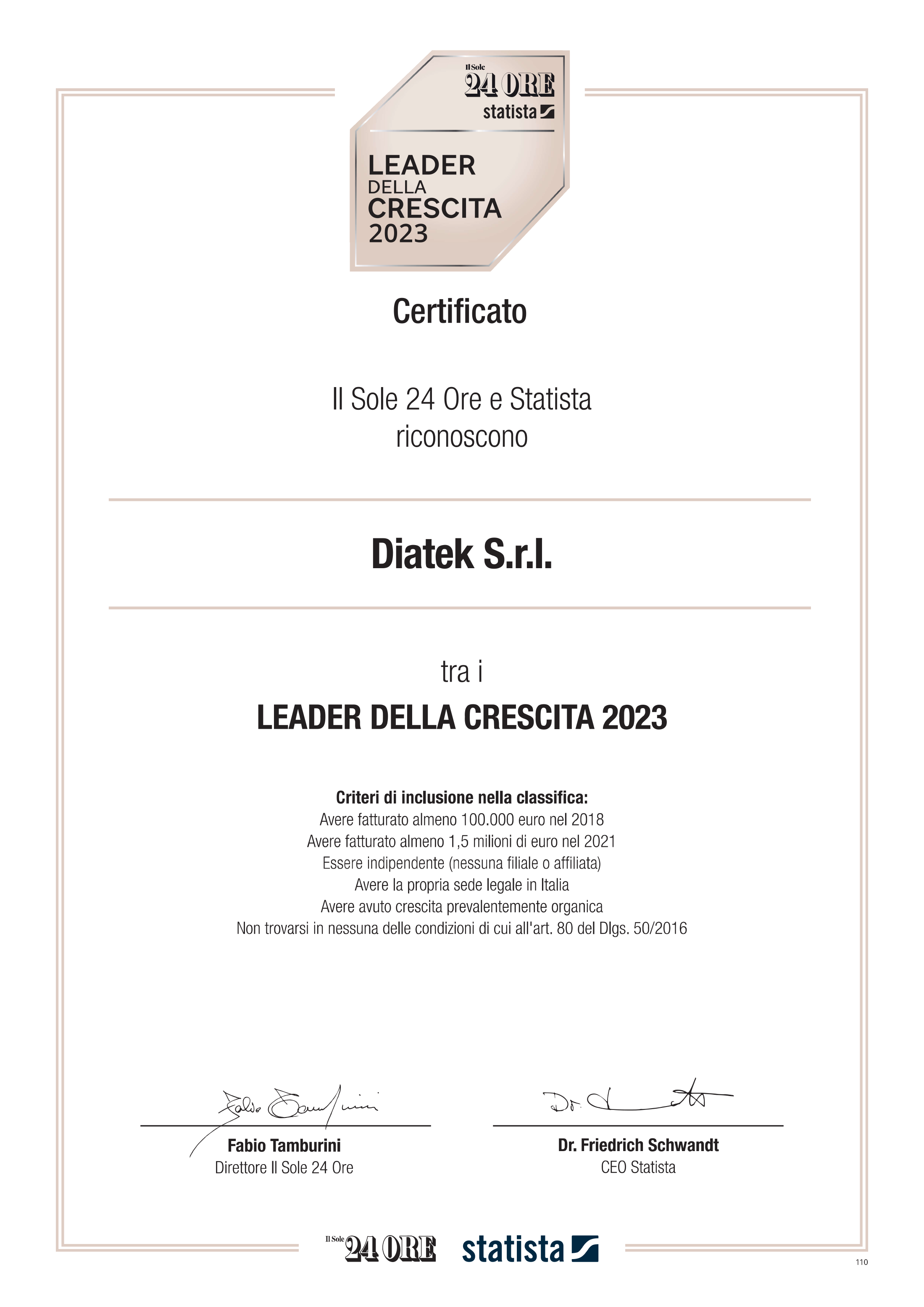 “Riconoscimento da parte de “IL SOLE-24 ORE” e STATISTA tra i Leader della crescita anno 2023”. next