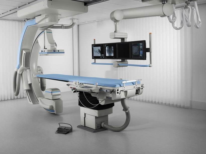 Sistema angiografo monoplanare con arco a C montato a soffitto, comprensivo dei pacchetti per l’ottimizzazione della qualità d’immagine alla minore dose applicabile.